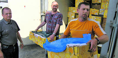 Norbert Koch (v. l.), Dirk Becker und Joachim Petkus von der Lidahilfe beim Entladen der insgesamt vier Lastwagen.